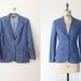 A blue blazer is displayed on a mannequin against a white background. The blazer is buttoned up and has a fitted silhouette. The mannequin is positioned on the left side of the image. | CITY BLUES blazer | Vintage 1970s fitted denim blazer | Vintage denim jacket | af7f2a0ff0a99407d3cdb0559e27d3bf0cb1f0477ba288f843b8bba8204f95af | 000720943512 | 0 | 0 | 33 | 13 | 0 | 0 | |