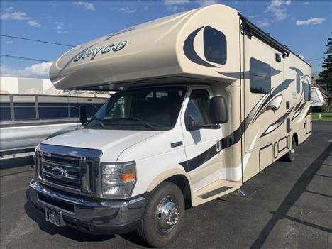 A white recreational vehicle with a 'Camping World' logo on the side is parked on a paved surface. The RV has a large windshield, side windows, and a rear window. There is a blue sky with clouds above, and a building can be seen in the background. | USED 2015 JAYCO GREYHAWK 31FS CLASS C RV #1141-1 | 374ecd6ee69faead5166a59f1f2aace094958c1d3cbaec472e75eda3b6d56b50 | 000720943496 | 0 | 0 | 47 | 9 | 0 | 0 | |