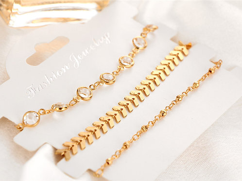 A close-up view of a jewelry display with four gold bracelets, each with a different design, placed on a white background. The bracelets are neatly arranged in a row, with the first one on the left featuring a simple gold chain, the second one in the middle with a gold chain and a small white gemstone, the third one on the right with a gold chain and a larger white gemstone, and the fourth one with a gold chain and a small white gemstone. The display is packaged in a clear plastic bag with a white label that reads 'FASHION JEWELRY'. | 3PC Fashion Bracelet Set | 85d46fb7159403cc9ce51311e3684e06dbbb30e75598e2f68e19774689ee1998 | 000720944059 | 0 | 0 | 101 | 4 | 0 | 0 | |