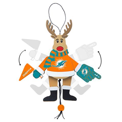 A festive holiday ornament featuring a cartoon reindeer wearing a teal and orange Miami Dolphins jersey, a teal beanie, and teal gloves. The reindeer is holding a teal and orange football, and there are two orange pom-poms hanging from the bottom of the ornament. The background is a plain white color. | Miami Dolphins Wooden Cheering Reindeer Ornament | 55772c31cc7aebaf005fdeb3c5cd9918cb70b4b9dff5af6975ccc570f439a3c3 | 000720944317 | 0 | 0 | 51 | 6 | 0 | 0 | |