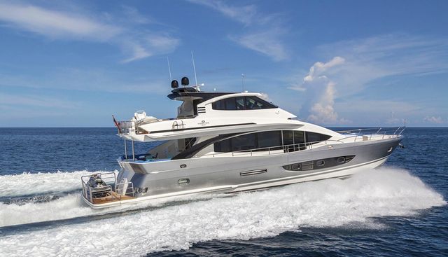 A modern, white luxury yacht with multiple decks and a sleek design is cruising on the ocean. The yacht has a large cabin with windows, a flybridge with a steering wheel, and a deck with outdoor seating. It is moving at a high speed, creating a wake behind it. The sky is clear with a few clouds, and the ocean is calm with gentle waves. | HAMPTON 830 Charter Yacht | c6fd626ebcf02e142510afce30b8ba00318b40a9df1710a2e3687f990690dd14 | 000720944221 | 0 | 0 | 65 | 4 | 0 | 0 | |
