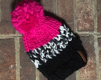 A pink and black knitted beanie with a white stripe is lying on a brick floor. The beanie has a fluffy texture and a pom-pom on top. The pink color is vibrant, and the black sections have a subtle sheen. The white stripe is wide and runs diagonally across the beanie. | Striped Hot Pink Chunky Knit Beanie // LIL BIT | c777bd626b7bdf367e3e21e58e80646cb5c4aba24f00cfa335affcc920b16945 | 000720944256 | 0 | 0 | 51 | 9 | 0 | 0 | |