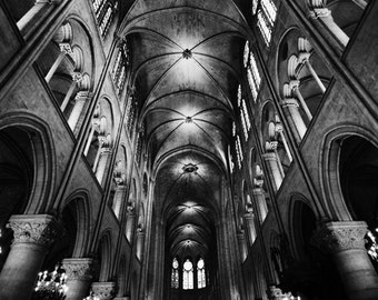 The first image shows an interior view of a grand cathedral with a high arched ceiling and a series of pointed arches supported by columns. The cathedral is dimly lit, with light filtering through the stained glass windows at the top, casting a warm glow on the stone floor and walls. The architecture is characterized by intricate details and a sense of historical grandeur. | Black and White Photography - Paris photograph, Notre Dame, Paris wall prints, gothic architecture, home decor, travel - "Heaven and Earth" | 8b7eaf6222c3f108338e015b2415f5df2c5460f4c74ba477e0d2ad77b3dd1fa0 | 000720944303 | 0 | 0 | 64 | 21 | 0 | 0 | |