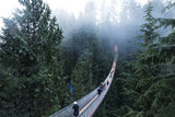 Aerial view of a suspension bridge over a dense forest with a group of people walking across it. The forest is shrouded in mist, and the bridge is suspended high above the trees. The people on the bridge are small and appear as dots, with one person noticeably larger than the others, possibly due to their position or attire. | Capilano suspension bridge Vancouver, British Columbia Canada. Suspension bridge on a foggy and misty day. Bridge in the forest surrounded by nature. | e924d40eff3ec5e6ad23ec426d918a7bd77eeae0cdd21f6eb56533d6c17ff0c7 | 000720944375 | 0 | 0 | 59 | 22 | 0 | 0 | |
