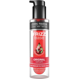 A clear plastic bottle with a black cap, containing a red liquid, is displayed against a white background. The label on the bottle reads 'JOHN FRIEDA' at the top and 'FRIZZ EASE' in the center. Below the brand name, there is a tagline 'FRIZZING KIT' and a logo. The label also includes a warning 'FOR EXTERNAL USE ONLY' and a list of ingredients. The bottle is positioned at an angle, showing the label and the liquid inside. | John Frieda Frizz-ease Serum Antiencrespamiento Original 50 Ml Unisex | c084991666598ce818c51a322c2ad035790a5d5ca047f35e42f6865a44057fb2 | 000720944448 | 0 | 0 | 77 | 9 | 0 | 0 | |