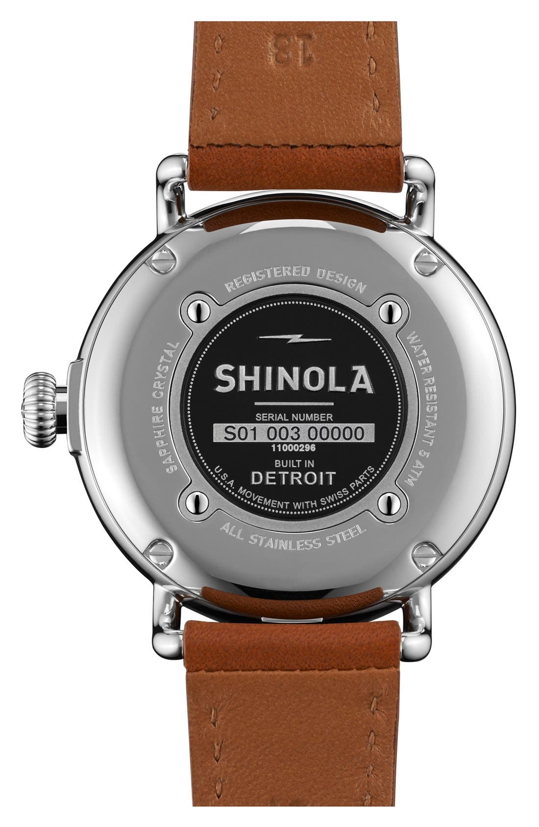 A silver wristwatch with a black face and a brown leather strap is displayed against a white background. | SHINOLA,\n 'The Runwell' Leather Strap Watch, 38mm,\n Alternate thumbnail 24, color,\n 201 | eccb1d3d2c780c74cdaf5544b6e95f92ae1c506e8d56ada94b7e7c401f171a43 | 000720944494 | 0 | 0 | 18 | 12 | 0 | 0 | |