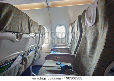 The first image shows the interior of an airplane cabin with multiple rows of seats. The seats are arranged in a 2-3 configuration, with two seats on the left side and three on the right side of the aisle. The seats are covered with fabric and have headrests. There are overhead compartments above the seats, and the cabin is well-lit with natural light coming from the windows. The image is not cropped, showing the entire cabin from the front to the back. | HANOI, VIETNAM - MAY 11, 2015: inside an Vietnam Airlines aircraft. | fb8a75a612c98ade06d2c39f3c0e62f67f291646de9922da537c070335765752 | 000720944421 | 0 | 0 | 82 | 11 | 0 | 0 | |