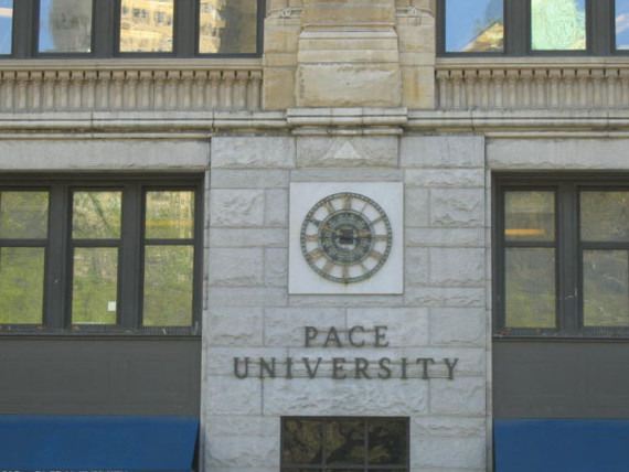 A close-up view of a building with a large clock mounted on the wall. The clock has Roman numerals and is centered between two windows. Below the clock, there is a sign that reads 'PACE UNIVERSITY'. The building has a stone facade with a decorative cornice above the clock. The sky is visible in the background, and there is a blue awning partially visible on the left side of the image. | Pace University | be1c5737ee982cba64ed58244a0700af8b0e921735a65ed6548abcb4c8c42749 | 000720944775 | 0 | 0 | 71 | 2 | 0 | 0 | |
