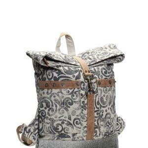 A backpack with a patterned design is displayed against a white background. The backpack has a brown leather strap and a metal buckle at the top, and a smaller brown leather strap with a metal buckle at the bottom. The pattern consists of swirling shapes in shades of gray, white, and black. | NWT Myra Floral Cowhide & Upcycled Canvas Backpack | 849c95b8ab41172511c64ee2bf7278948e6edced9eecdba2ad1cad5ba1de0a5f | 000720944990 | 0 | 0 | 52 | 8 | 0 | 0 | |