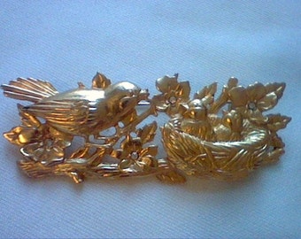 A golden brooch with intricate designs featuring a bird in flight on the left and a bird in a nest on the right, both surrounded by floral elements, is displayed on a white background. | Vintage gold tone birds in a nest brooch pin | 4a5a74cb8c7cb985b7b35f9c73ab3a8715dc8c80327206e0ca3d4f8ac9295ad9 | 000720944926 | 0 | 0 | 34 | 9 | 0 | 0 | |