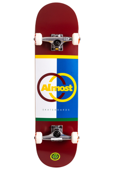 A red skateboard with a white, yellow, and blue graphic design on the underside of the deck. The graphic features a stylized 'ALMOST' logo with a yellow circle around it, and the words 'SKATEBOARDS' in white. The skateboard has white wheels and orange trucks. | Almost Ivy League Skateboard | 89b8af066e060129ef117bb491157fed87ae6a9f7b97bf2349cc7976b716d131 | 000720944985 | 0 | 0 | 44 | 4 | 0 | 0 | |