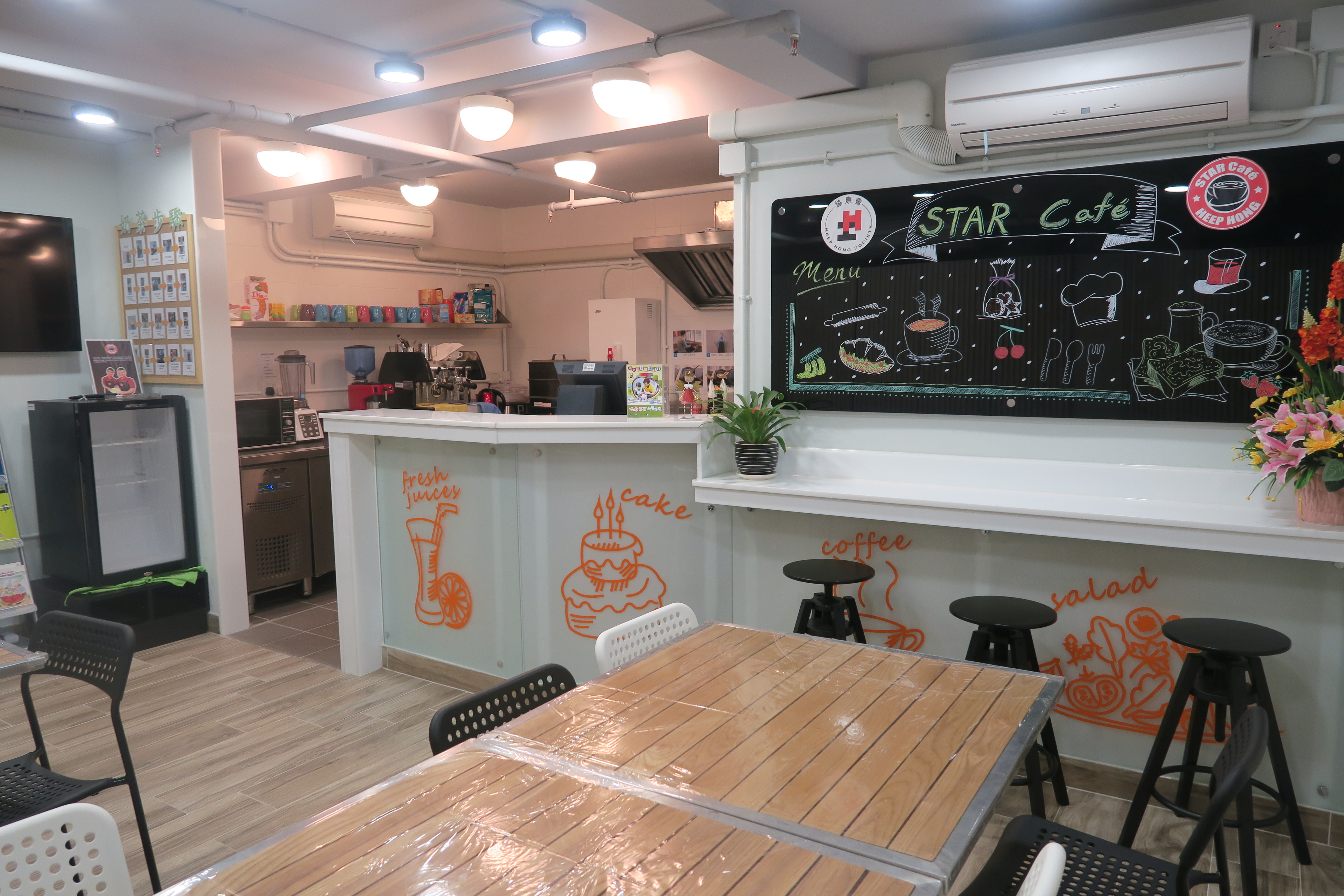 The first image shows the interior of a cafe with a modern design. The walls are adorned with colorful chalkboard art, including a large sign that reads 'STAR CAFE' with various illustrations of food and drinks. The cafe has a clean and minimalist aesthetic with a white counter, wooden tables, and black stools. There are potted plants and a vase with flowers on the counter, and the floor is covered with light-colored tiles. The lighting is bright, and there are hanging lights above the tables. | STAR Cafe | 6b9129222c7de14eabfecd41220cc2cd29c97e569b6f5f84dcc61fe369d7c386 | 000720943474 | 0 | 0 | 85 | 2 | 0 | 0 | |