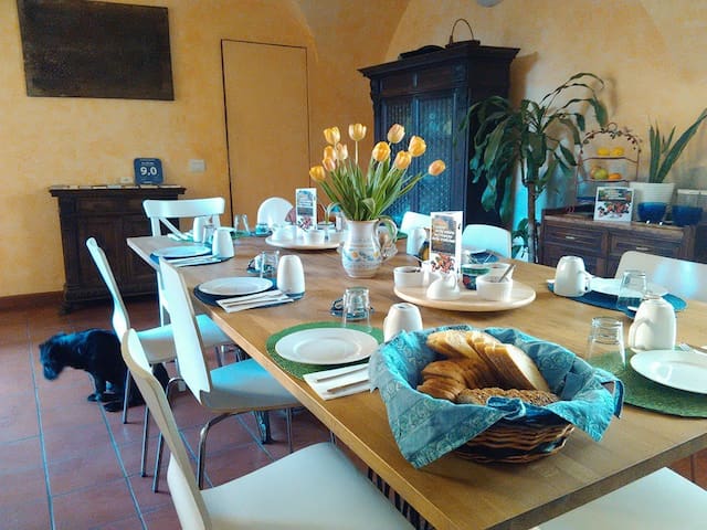 A wooden dining table is set with plates, silverware, and glasses for a meal. The table is surrounded by white chairs with blue cushions. A basket of bread is placed in the center of the table, and a vase with yellow tulips is on the table. The room has a warm ambiance with yellow walls and a large window with a view of a tree. There is a black dog sitting on the floor near the table. | Garden Room at Al Canto B&B - Firenze - Bed & Breakfast | a522fe68e69bf0f3e4fa8da22ed406516106cc1345de1f75099ca6e13b304b39 | 000720945375 | 0 | 0 | 77 | 12 | 0 | 0 | |