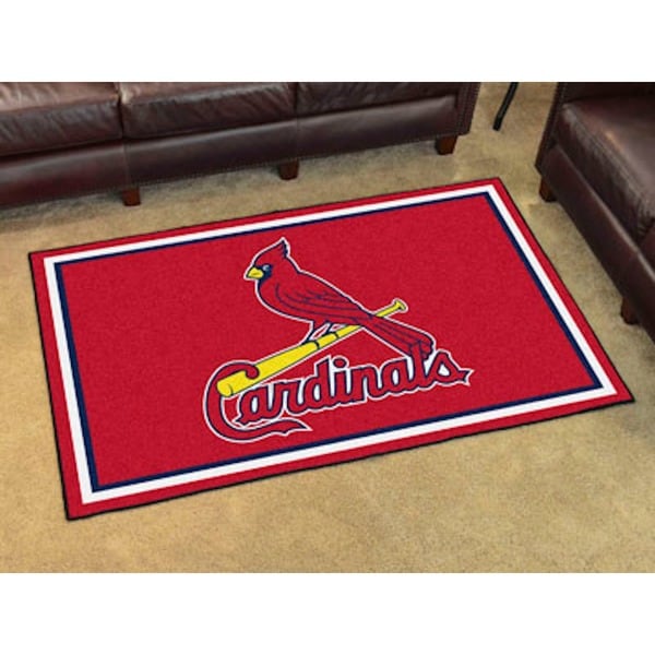 A red and blue carpet with a large white baseball bat and a red cardinal bird in the center, surrounded by the words 'Cardinals' in white letters. The carpet is placed on a beige carpeted floor, and there is a brown leather couch in the background. | Fanmats MLB St Louis Cardinals Area Rug (4' x 6') | 6bb2b1cefd67671bf5fe678f8d376d1ff164541b370f23dd5eb64f6692075982 | 000720945291 | 0 | 0 | 46 | 10 | 0 | 0 | |