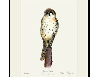 A framed illustration of a small brown sparrow perched on a branch. The illustration is detailed, showing the bird's feathers, eye, and beak. The frame has a white border with a signature and a date in the bottom right corner. | American Kestrel Limited Edition Signed Print | 3a268ddb9e2133be6917d5479a760dc82f1ab40cc76a47adae3a03c2788d94d7 | 000720945371 | 0 | 0 | 40 | 6 | 0 | 0 | |