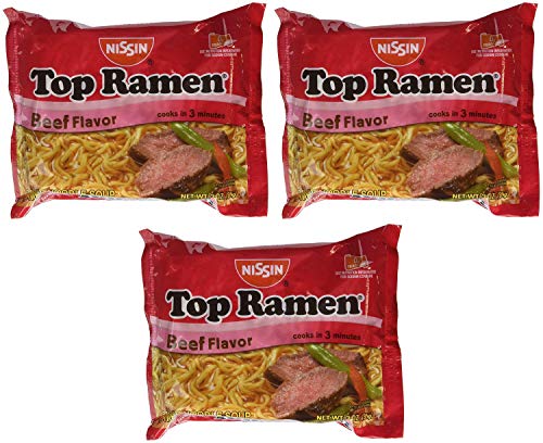 Three red bags of Top Ramen Beef Flavor are displayed against a white background. Each bag is filled with noodles and contains a piece of beef. The bags are labeled 'NISIN' and 'TOP RAMEN' in white text. The image is a close-up of the bags, with no other elements visible in the background. | Nissin Top Ramen Beef Flavor Ramen Noodle Soup 3 oz (Pack of 24) | 45e63592e332cec6a9ac17d5d4c605acdc139e6dfc98fa61591a8006fe9c9b7b | 000720945314 | 0 | 0 | 53 | 13 | 0 | 0 | |