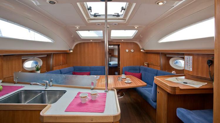 The first image shows the interior of a luxurious yacht with a modern design. The space is well-lit with natural light coming from the windows and a skylight. The interior features a wooden paneling and a blue sofa with a wooden table in front of it. On the table, there are two cups and a bowl. The kitchen area has a sink with a faucet, and there is a potted plant on the countertop. The floor is made of wooden planks, and there is a pink cloth on the floor near the table. | Discover Split region surroundings on this Elan 434 Impression Elan Marine boat | c8c17c155d8c8673702118a00bddb19a27c0f822298006663be95ca44d90f356 | 000720945242 | 0 | 0 | 93 | 12 | 0 | 0 | |