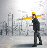 A man in a suit and hard hat is holding a large yellow pencil in front of a whiteboard filled with architectural drawings. The drawings include buildings, a bridge, and a plane. There are also a few clouds, a sun, and a smiley face drawn on the whiteboard. | Draft of an architect | 5c72a058cd89bb62ac8c475041554c803685dd7debcfb7e3f9e30c17bc67e302 | 000720945311 | 0 | 0 | 48 | 4 | 0 | 0 | |