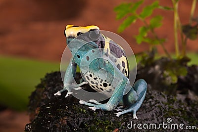 A blue poison dart frog with black and yellow markings on its back is perched on a moss-covered rock. The frog has a patterned skin with a dotted texture and is surrounded by green foliage. | Poison dart frog with bright blue yellow colors | 3a241b3a82f1a7e4611d9b939b79d42a93d14eae3776b1a990d5f9ab3fc76bc1 | 000720945327 | 0 | 0 | 35 | 8 | 0 | 0 | |