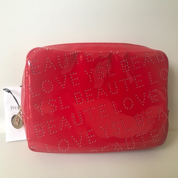 A red purse with a shiny surface and a pattern of white dots and text that reads 'BEAUTY IS BEAUTY LOVE IS BEAUTY BEAUTY IS LOVE YOU BEAUTY LOVE YOU' is displayed against a white background. The purse has a gold zipper and a gold charm hanging from the zipper. There is a white tag with a gold emblem attached to the purse. | c2f80da45f27 YSL beaute Red patent Makeup clutch bag | a540a417149fafd50a8352e4249ebb8587fc44d3b25a13c74b0caf902b87d896 | 000720945922 | 0 | 0 | 63 | 8 | 0 | 0 | |