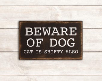 A rustic wooden sign with a black border and text that reads 'BEWARE OF DOG. CAT IS SHITTY ALSO' is mounted on a wooden wall. | Funny Dog Sign; Funny Pet Gift; Dog Wood Sign; Dog Mom; Dog Dad; Dog Decor; Dog Life; Beware of Dog | b4e85a1b598dece03638ee76062d227b824bbbd0b8d986ab73cab6811b669589 | 000720945993 | 0 | 0 | 25 | 20 | 0 | 0 | |