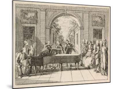 A black and white illustration of a classical concert scene with a grand piano in the center. The piano is being played by a pianist seated at the instrument. In the background, there are several people dressed in period attire, suggesting a historical setting. The architecture features classical elements such as columns and arches, and there are framed paintings on the walls. The scene is framed within a picture frame, giving it the appearance of a framed artwork. | Five Instrumental Performers and a Singer Entertain an Aristocratic Audience in a Stately Home-Daniel Chodowiecki-Mounted Giclee Print | 46b955032dc73c74698ecda1069548b4434e4f3d63840a835e368a9029ab1c6c | 000720946050 | 0 | 0 | 78 | 17 | 0 | 0 | |