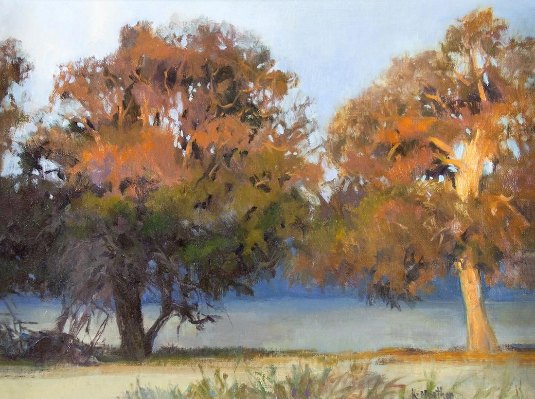 A painting of a serene landscape with two large trees on the left, their leaves in shades of orange and brown, suggesting autumn. The trees are set against a backdrop of a calm body of water, which reflects the trees and the sky above. The sky is a gradient of blue, with a hint of white clouds near the horizon. The ground is covered with grass and a few scattered leaves, and the overall color palette is dominated by warm tones of orange, brown, and blue. | An Early Hour by Kay Northup (20th/21st Century) | 9ec3e7758fdb2ada71e983d69bfc1cf81c064fa4a014748226b6cc85c5dba28f | 000720946010 | 0 | 0 | 86 | 8 | 0 | 0 | |