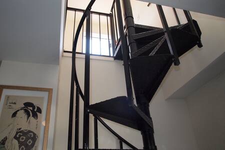 A black spiral staircase with a metal railing is situated in a room with white walls. The staircase is positioned against a wall with a framed picture of a woman in a floral dress. The room has a modern and minimalist aesthetic. | 2 story Apt in East Village | 86c5137599f507a46781b54763cf82a7946d2c08a6933bdecbf85dd3cbeebef3 | 000910677864 | 0 | 0 | 42 | 6 | 0 | 0 | |