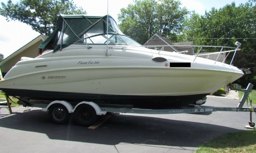 A white speedboat with a green canopy is parked on a trailer in a driveway. The boat has a black stripe running along its bottom and is equipped with a steering wheel and a small window. The trailer has white wheels and is attached to a black tow bar. The driveway is made of asphalt, and there are trees and a house in ... | Image of Rinker Fiesta Vee 266 for sale in United States of America for $13,000 (\xc2\xa39,892) Collegeville, Pennsylvania, United States of America | 942ed11a3b1a43798f12b4dcd2207a6dd320d70a54e7972b34c6dfa89f0d0e24 | 000910677871 | 0 | 0 | 65 | 22 | 0 | 0 | |