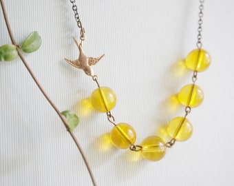 A close-up of a yellow glass bead necklace with a bird pendant, featuring a chain and a clasp, displayed against a white background with a green leafy branch on the left side. | Swallow Necklace Soar Necklace Bird Necklace Deep Yellow Necklace Yellow Jewelry Minimalist Necklace Bridesmaid Jewelry Bridesmaid Gift | 0863fcae21f580aef61deb83715295b5c728a078f941a35fc14a4123fb536676 | 000910677866 | 0 | 0 | 32 | 17 | 0 | 0 | |