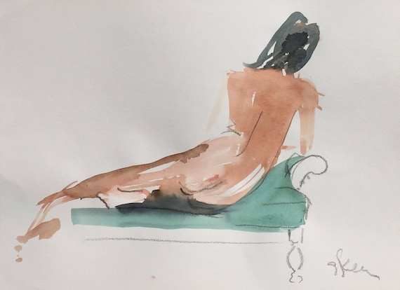 A watercolor painting of a woman sitting on a couch with her back to the viewer. The painting is in shades of blue, brown, and white, with visible brush strokes and a textured appearance. The woman's hair is dark, and she is wearing a white dress that is transparent and revealing. The couch is green, and there is a whi... | Nude painting- Original watercolor painting of Nude #1447 by Gretchen Kelly | 638b5e87c2e951ea606ff31e49159498403a13df5d3de1b5626fa3fe98a5733d | 000910677968 | 0 | 0 | 72 | 11 | 0 | 0 | |