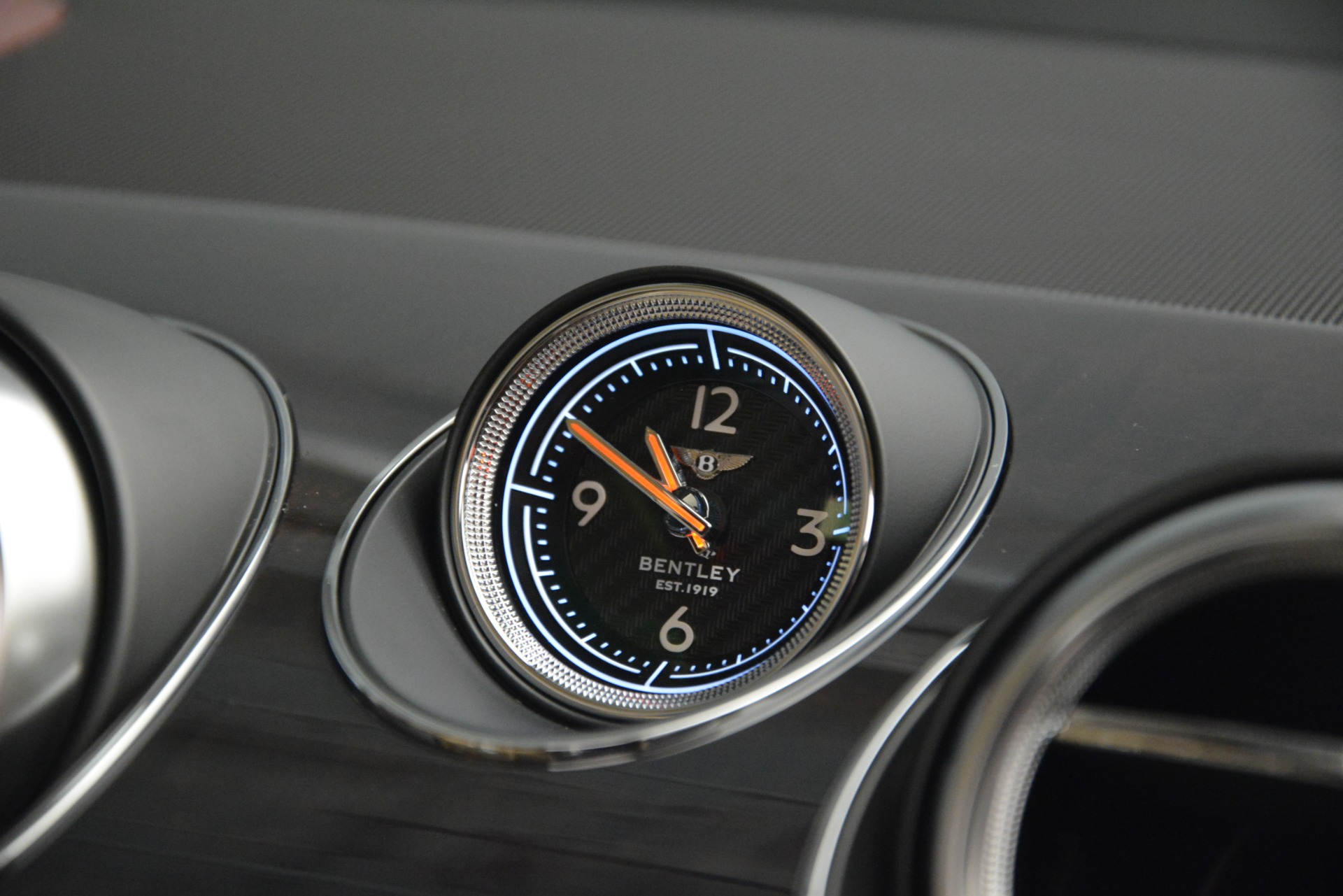 A close-up view of a car's dashboard showing a digital clock with a black face and white numbers, displaying the time as 10:10. The clock is positioned above a gear shift lever, and the dashboard has a metallic finish with a textured surface. | Used 2019 Bentley Bentayga V8 For Sale In Greenwich, CT 2702_p30 | e948dde9360201e18cd3adf42ce77260b2e44640f754672d0837eabc5f153c5e | 000910677901 | 0 | 0 | 43 | 11 | 0 | 0 | |