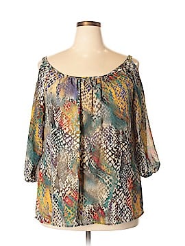 A mannequin displays a colorful, patterned blouse with a V-neckline and short sleeves. The blouse features a mix of bright colors and intricate patterns, including geometric shapes and floral designs. The mannequin is positioned against a white background, and the blouse is showcased on a hanger. | Miss Tina by Tina Knowles 3/4 Sleeve Blouse Size 2X (Plus) | 0012df905b12b61c4dc135e3b38b62fe5067775e3f4ec7c08e02c8523440d8f7 | 000910678227 | 0 | 0 | 46 | 11 | 0 | 0 | |