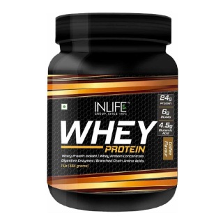 A close-up image of a black and gold Inlife Whey Protein powder container with a label that reads 'WHEY PROTEIN' in large white letters. The label also displays the brand name 'INLIFE' and the phrase 'GROUP STANDS 2019'. The container is filled with a dark brown powder, and the label features various nutritional inform... | INLIFE Whey Protein Powder, 1 lb Coffee | af7e6c7330e1dd352e3cad3abc1b058d315f4bd4b7057afe7aa40e7893e00622 | 000910678256 | 0 | 0 | 57 | 7 | 0 | 0 | |