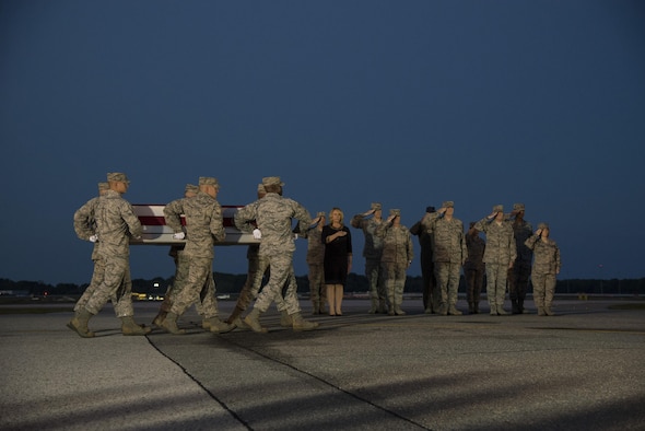 A group of military personnel in uniform are carrying a flag-draped coffin on a runway at night. The sky is dark, and the runway is illuminated by lights. The soldiers are in various positions, with some holding the coffin and others standing guard. The scene conveys a sense of solemnity and respect. | An Air Force carry team carries the remains of Maj. Troy Gilbert as the official party renders honors during a dignified transfer Oct. 3, 2016, at Dover Air Force Base, Del. Maj. Troy Gilbert, an F-16 Fighting Falcon pilot, was killed Nov. 27, 2006, in an F-16 crash 30 miles southwest of Balad Air Base, Iraq. Gilbert w... | edb46e0de63ed17f24f77aeb81085c77e1ae7dbdda2f28845f94b67326e4090f | 000910678095 | 0 | 0 | 52 | 93 | 0 | 0 | |