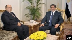 Two men are seated in ornate chairs in a room with a potted plant and a vase on a table between them. The man on the left is wearing a dark suit with a tie and has a beard, while the man on the right is also wearing a dark suit with a tie and has a beard. Both men have their hands clasped together. | In this photo released by the Egyptian Presidency, President Mohamed Morsi, right, poses for a photograph with his new Prosecutor General, Talaat Abdullah, left, in Cairo, Egypt, Thursday, Nov. 22, 2012. | faeb11b7cb8e42fbcdf46928b01a2de34ef0cfff58e2335f7311247ae9a9b3ac | 000910678416 | 0 | 0 | 65 | 31 | 0 | 0 | |