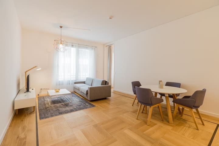 A modern living room with a gray sofa, a wooden coffee table, and a dining table with four chairs. The room has a large window with sheer curtains, a white wall, and a wooden floor. There is a flat-screen TV on the left side of the room, and a small rug on the floor. | Luxury Apartment in Berlin Mitte -Palais Varnhagen | bdf9ff65323fcb2ac52362f34583a1d245db7fde9c66a5917284ce5167c456d8 | 000910678680 | 0 | 0 | 54 | 7 | 0 | 0 | |