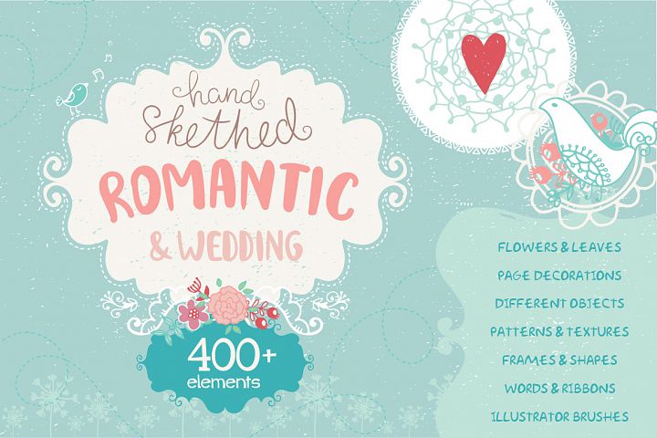 The second image is a digital illustration that resembles a wedding invitation or a romantic-themed stationery design. It features a pastel color scheme with shades of blue, pink, and white. The design includes a heart-shaped pattern with a dove inside, surrounded by floral elements and decorative swirls. The text 'Han... | Romantic & Wedding Hand Drawn Set | 00f143134594954060790249481700276cf33811e71c7334ef5358361a71602d | 000910678699 | 0 | 0 | 101 | 6 | 0 | 0 | |