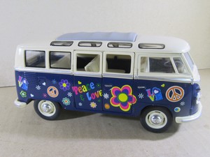 A small toy van with a psychedelic paint job is parked on a white background. The van has a blue base with colorful flowers, peace signs, and hearts painted on it. The windows are tinted, and the van has a rounded front and a flat rear. | 875T Kinsmart KT7005F Volkswagen VW T1 Combi 1962 Bus Peace & Love Bleu 1:24 | 64fb97d3dfa7120aaef82a0e10059014e836be86689cecb877cf1cafe37805c3 | 000910678732 | 0 | 0 | 46 | 14 | 0 | 0 | |