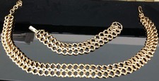 A close-up image of a gold chain with a clasp, lying on a dark surface. The chain is intricately designed with interlocking links and has a shiny, polished appearance. The clasp is attached to the top of the chain and is also gold in color. | Signed Monet Gold Tone Chunky Chain Link Graduated 18.5" Necklace 7.5" Bracelet | 59f8575e51ca94f108aac7b84cb767f7958da0a95b9cde228539b0496bbfb209 | 000910678985 | 0 | 0 | 45 | 12 | 0 | 0 | |