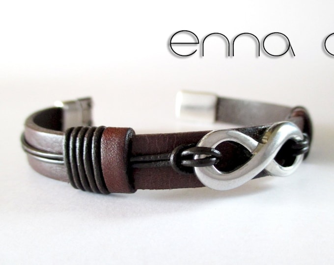 A close-up image of a bracelet with a textured brown leather strap and a silver metal clasp. The bracelet is placed on a white background with the text 'ENNA' in a stylized font above it. | Infinity brown leather bracelet, leather wristband, man bracelet, brown bracelet, birthday gift, leather accessories for men, man gifts | 92db2835f0ccae00aff8c37d8ec51b077bf266853837bf4db4dbf02f47dd597b | 000910678954 | 0 | 0 | 35 | 18 | 0 | 0 | |