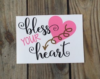 A white card with a pink and gold heart design on it. The card has the phrase 'Bless Your Heart' written in cursive black ink. The heart is surrounded by a decorative swirl pattern. The card is placed on a wooden surface with visible wood grains. | Bless your Heart Vinyl Decal~ Valentine's Day Decal~ Southern Sayings | d6f7dbb605ae042e53f2b156bfa319c3d1b8bb4d5af0843aaaf2089576c80694 | 000910678974 | 0 | 0 | 46 | 10 | 0 | 0 | |