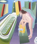 A surreal painting depicting a nude figure with long hair, sitting on a bench with a yellow object in front of them. The figure is surrounded by a vibrant, abstract landscape with multiple layers of colors and shapes. The scene includes a swimming pool with a diving board, a yellow and green striped wall, and a blue sk... | *AR DERMOT HOLLAND (20th century) Irish Bath Time Oil on canvas Signed to verso 81.5 x 101. | 6cb67ea28f1c9697028ad61889b93f0e1c86d028a8ba8e9d45b3926f82f73946 | 000910678968 | 0 | 0 | 62 | 17 | 0 | 0 | |