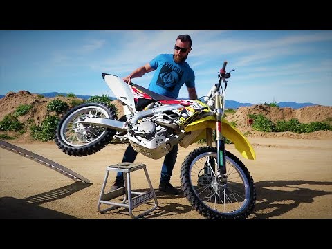 A man is performing a wheelie on a dirt bike in a desert setting. He is wearing a blue t-shirt, jeans, and sunglasses. The dirt bike is white and yellow with a number 4 on the side. The man is standing on a small metal stool, and the bike is lifted off the ground with the front wheel in the air. The background shows a ... | How to put dirt bike on stand - easy way | 1a6f412881136d122a3d36aa9deec7bc39277b4043082845684a9916e5e722ce | 000910679688 | 0 | 0 | 74 | 10 | 0 | 0 | |