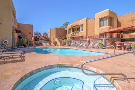 A sunny day at a hotel pool with clear blue water, surrounded by sun loungers and umbrellas. The pool is bordered by a tiled area with a metal railing. In the background, there are hotel rooms with balconies overlooking the pool area. | Luxury Condo in Old Town Scottsdale - Scottsdale - Wohnung | 869035ac4846712c7bf095d4c988fa1ca812dbe0d91597d252f99059f5eff358 | 000910679988 | 0 | 0 | 42 | 10 | 0 | 0 | |