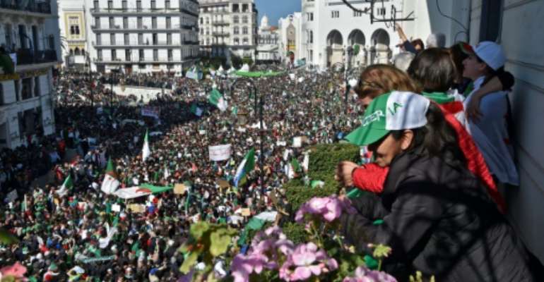 A large crowd of people is gathered in a city square, with many individuals wearing green and white hats and scarves. Some people are standing on balconies overlooking the scene, while others are in the crowd. There are flags and banners with green and white colors, and the atmosphere appears festive and celebratory. | Hundreds of thousands of Algerians had taken to the streets in recent weeks demanding longtime leader Abdelaziz Bouteflika resign. By RYAD KRAMDI (AFP/File) | a2c7f56a031603d9f1a2985ecc600fb140659f4e78860b436ff090f6fc2f5348 | 000910680204 | 0 | 0 | 53 | 23 | 0 | 0 | |