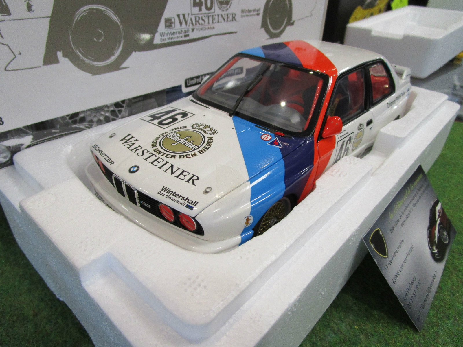 A small model car is displayed in a white box with a green surface underneath. The model car is white with blue and red stripes and has the number 46 on its side. The box has a label with the text 'WARTSCHIER' and a logo. There is a small sign next to the box with the text 'WARTSCHIER' and a logo. | BMW M3 Class Winner CALDER WTC 1987 RAVAGLIA echelle 1 18 d MINICHAMPS 180872046 | 5a79304560aa4b563c08b43e5245a85be898cbfc2ad6451ddd0a7ea78ad4b0e6 | 000910681015 | 0 | 0 | 61 | 14 | 0 | 0 | |