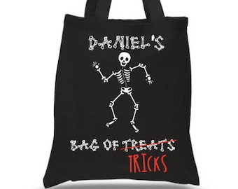A black tote bag with a white skull and crossbones design in the center, surrounded by the words 'DANIEL'S' above and 'BAG OF TREATS' below. The skull is stylized with a smile and a tongue sticking out. The words 'TRICKS' are written in red at the bottom of the bag. | Halloween, Personalized Halloween Bags, Candy Bags, trick or treat, halloween bags, Disney, skeleton | 4961a6aa672055d0ca234a043d0419be3c55dd9a85736941a2f96c2589b6cb7d | 000910681005 | 0 | 0 | 50 | 13 | 0 | 0 | |