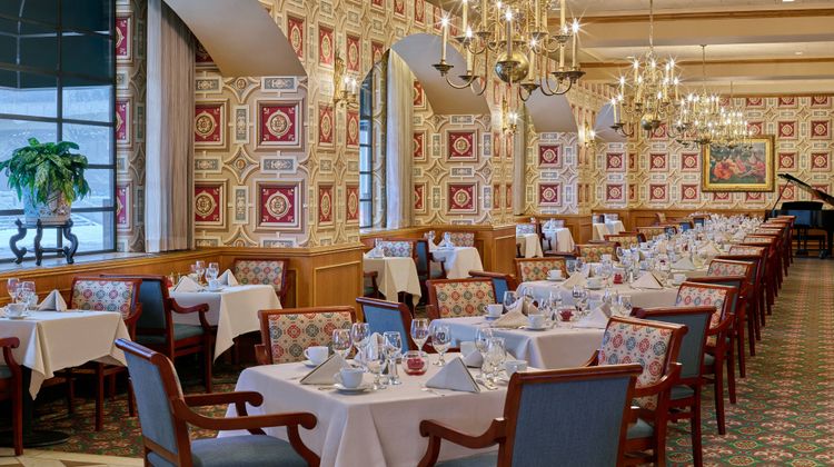 A spacious dining room with a long row of tables covered with white tablecloths, each set with a complete dinnerware including plates, glasses, and silverware. The room is adorned with red and white patterned wallpaper, and the tables are surrounded by blue upholstered chairs. The floor has a floral pattern, and the room is well-lit by large chandeliers hanging from the ceiling. A grand piano is visible in the background, and a large window allows natural light to enter the room. | Brown Palace Hotel & Spa, Autograph Coll Restaurant | c1d0b1f2e0594a96afbd670dd8d1ed8ceb35b42ebdc026467884a2995b2a2696 | 000910681024 | 0 | 0 | 81 | 8 | 0 | 0 | |