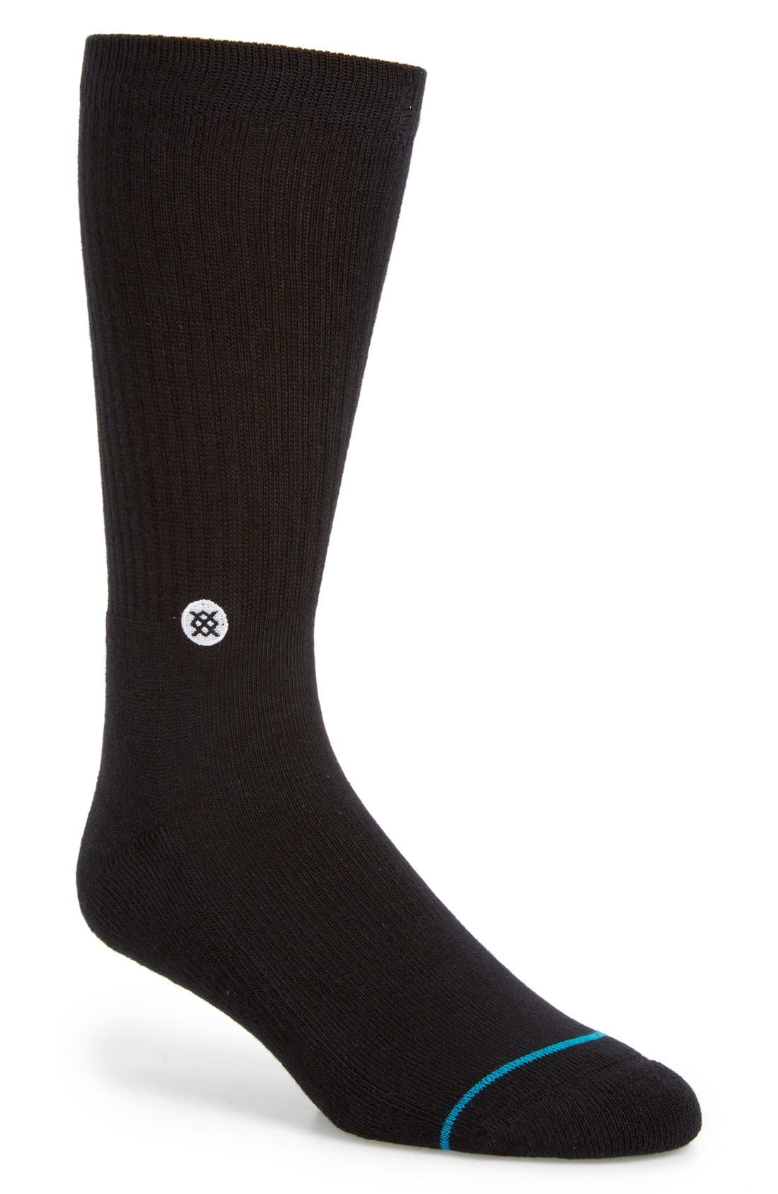 A close-up image of a single black sock with a white logo on the left ankle and a blue stripe at the top. The sock is against a white background. | STANCE 'Icon' Crew Socks, Main, color, BLACK/ WHITE | ba5771e7802adfae5fddb1a73ff33b0cee3410bc57a6728fa6afcbf8f13873fc | 000910681027 | 0 | 0 | 30 | 8 | 0 | 0 | |